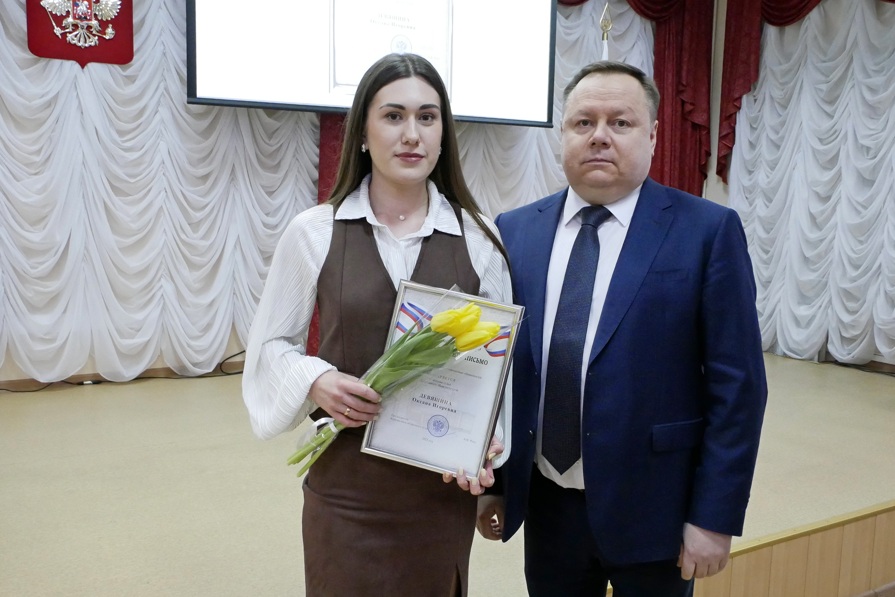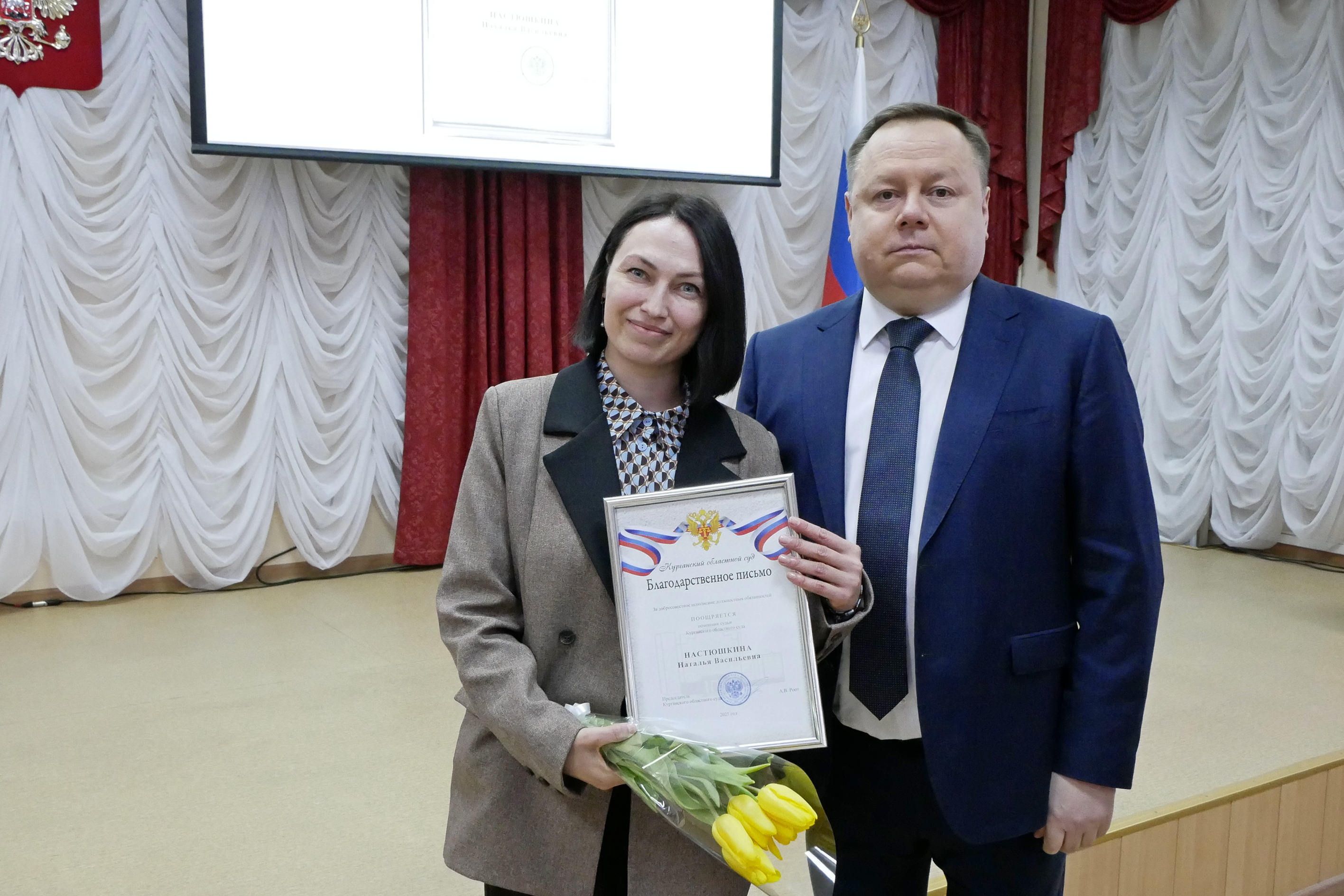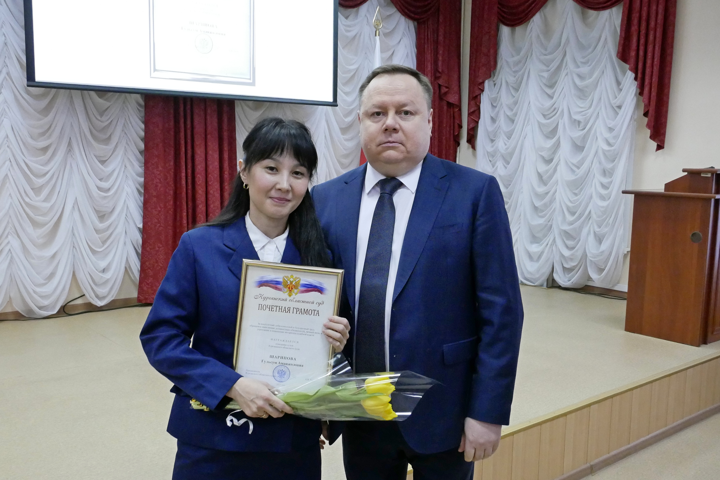 6 марта в Курганском областном суде состоялось торжественное собрание, посвященное Международному женскому дню. Председатель суда Роот Андрей Валерьевич поздравил женскую часть коллектива с предстоящим праздником. «Желаю вам прекрасного настроения, крепкого здоровья, человеческого счастья. Чтобы ваши любимые мужчины сегодня сказали, как они вас любят, ценят, насколько вы прекрасны, нежны и необходимы нам, мужчинам», – сказал он. В торжественной обстановке Андрей Валерьевич вручил награды наиболее отличившимся сотрудникам аппарата суда. Знаками отличия Судебного департамента при Верховном Суде Российской Федерации «За усердие» II степени награждены ведущие специалисты Осипова Н.В. и Тарасова Н.Ю. Почетной грамотой Курганского областного суда награждены помощники судей Антонова Ж.С. и Шарипова Г.А. Благодарственным письмом Курганского областного суда поощрены помощники судей Девяшина О.И. и Настюшкина Н.В. С предстоящим праздником женскую часть коллектива Курганского областного суда поздравили музыкальные исполнители города Кургана. |